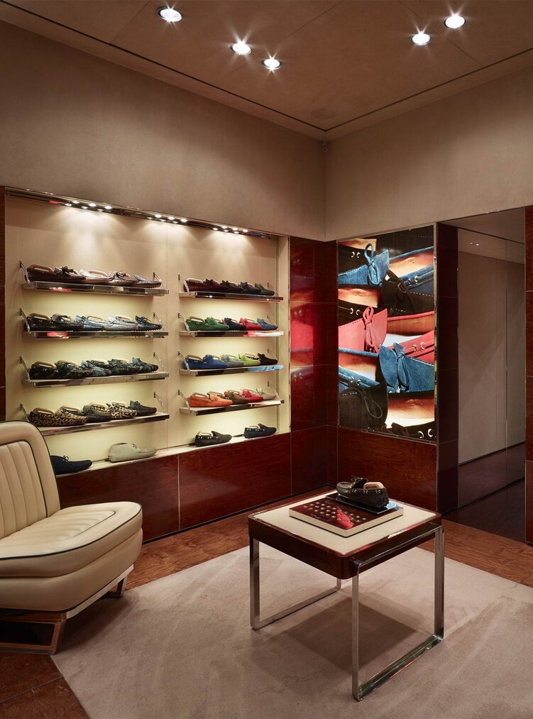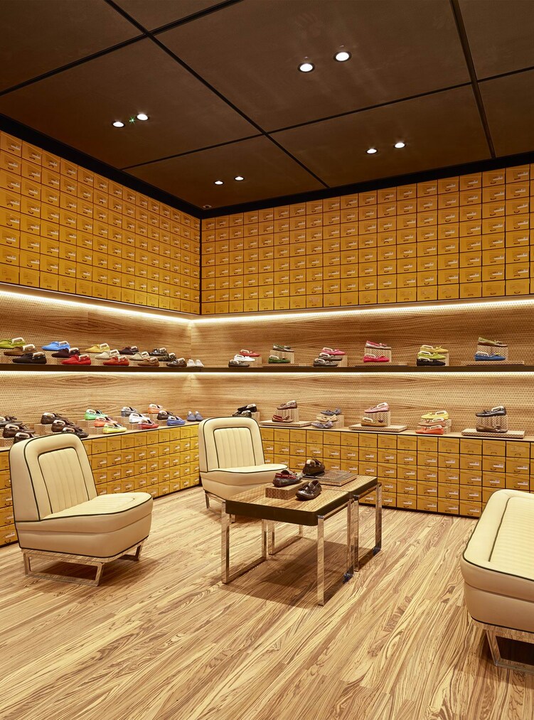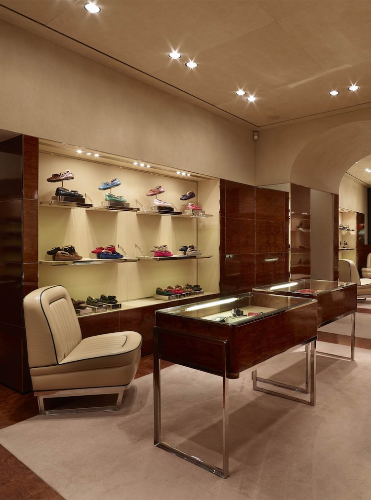 In 2002, the first Car Shoe flagship store opened in Via della Spiga 50, in Milan: a wide open space reflecting the brand's duality of dynamism and tradition. Later, the store moved to its current location in Via della Spiga 1, with a modern, subtly sophisticated architectural concept. The choice of fine materials, such as briar root, Alcantara, and leather, is inspired by luxury cars, and every detail conveys a true sense of craftsmanship.