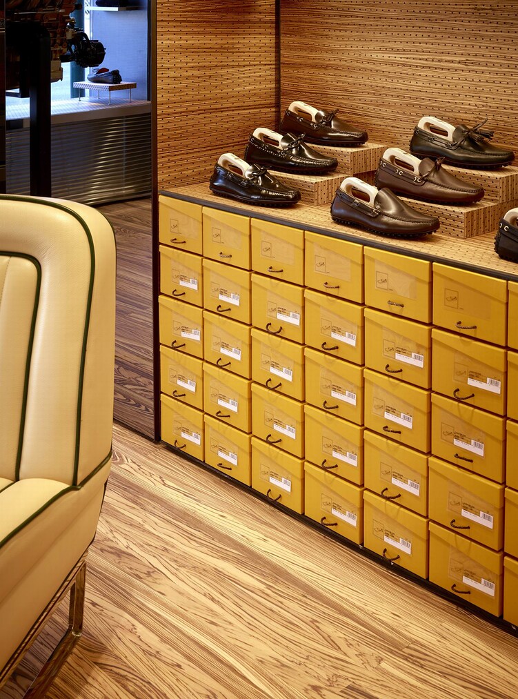 In 2002, the first Car Shoe flagship store opened in Via della Spiga 50, in Milan: a wide open space reflecting the brand's duality of dynamism and tradition. Later, the store moved to its current location in Via della Spiga 1, with a modern, subtly sophisticated architectural concept. The choice of fine materials, such as briar root, Alcantara, and leather, is inspired by luxury cars, and every detail conveys a true sense of craftsmanship.